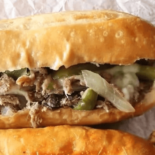 Marinated chopped cheesesteak with green peppers, onions and mozzarella