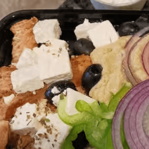 Grilled chicken over perfectly cooked rice topped with cucumber, tomatoes, olives, red onions, feta cheese, hummus served with homemade tzatziki sauce.