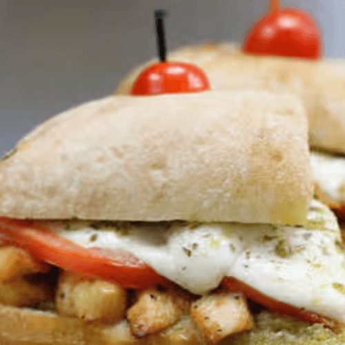 Marinated grilled chicken, pesto sauce, sliced tomato, fresh mozzarella cheese, touch of olive oil & parsley