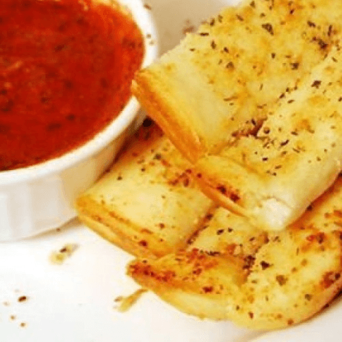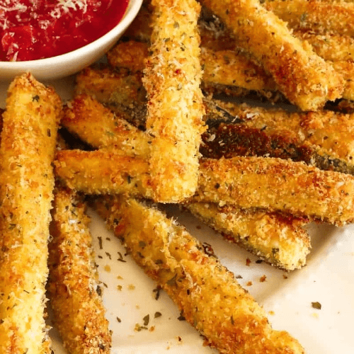 Zucchini sticks dipped in an egg mixture with bread crumbs, Parmesan cheese, baking powder, & salt, fried until golden brown.