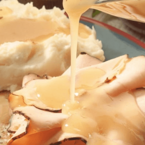 Tender thin sliced roasted turkey breast atop bread with mashed potatoes and gravy